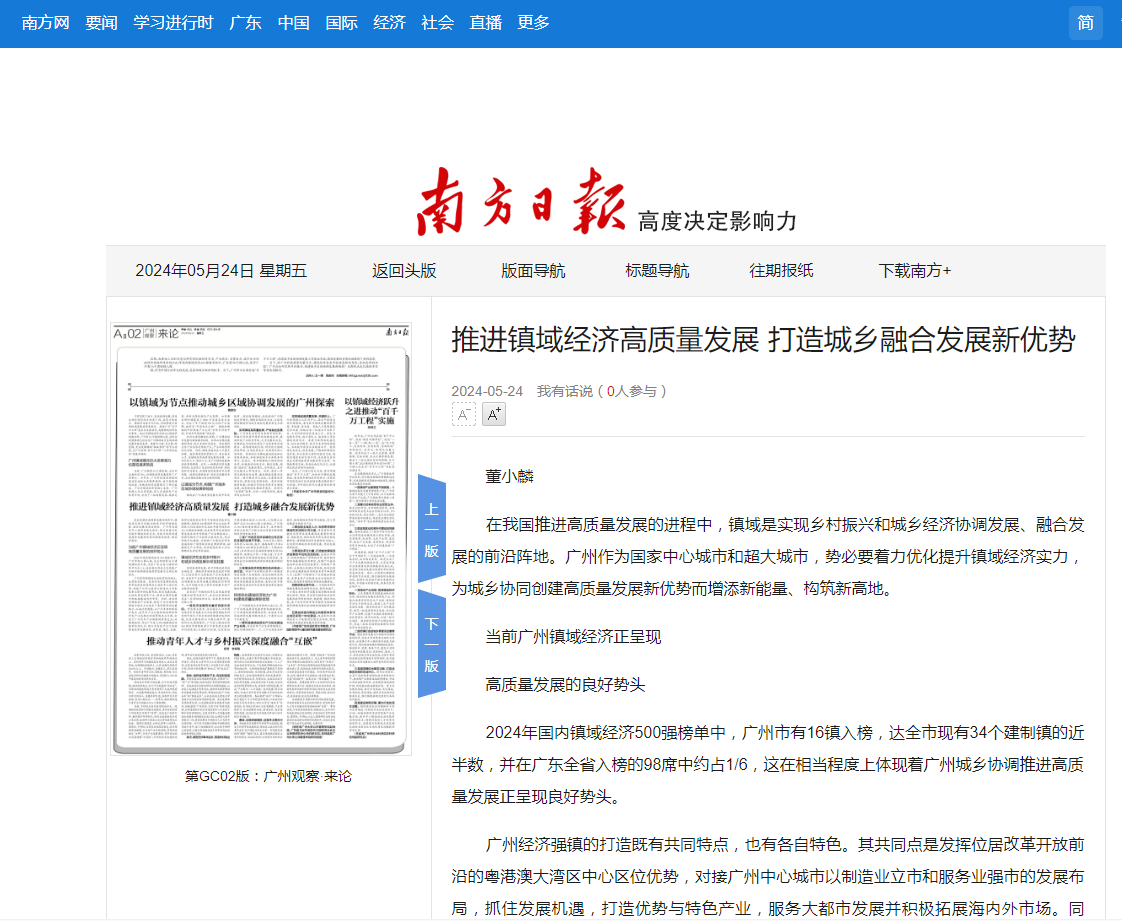 在我国推进高质量发展的进程中,镇域是实现乡村振兴和城乡经济协调发展、融合发展的前沿阵地。广州作为国家中心城市和超大城市,势必要着力优化提升镇域经济实力,为城乡协同创建高质量发展新优势而增添新能量、构筑新高地。